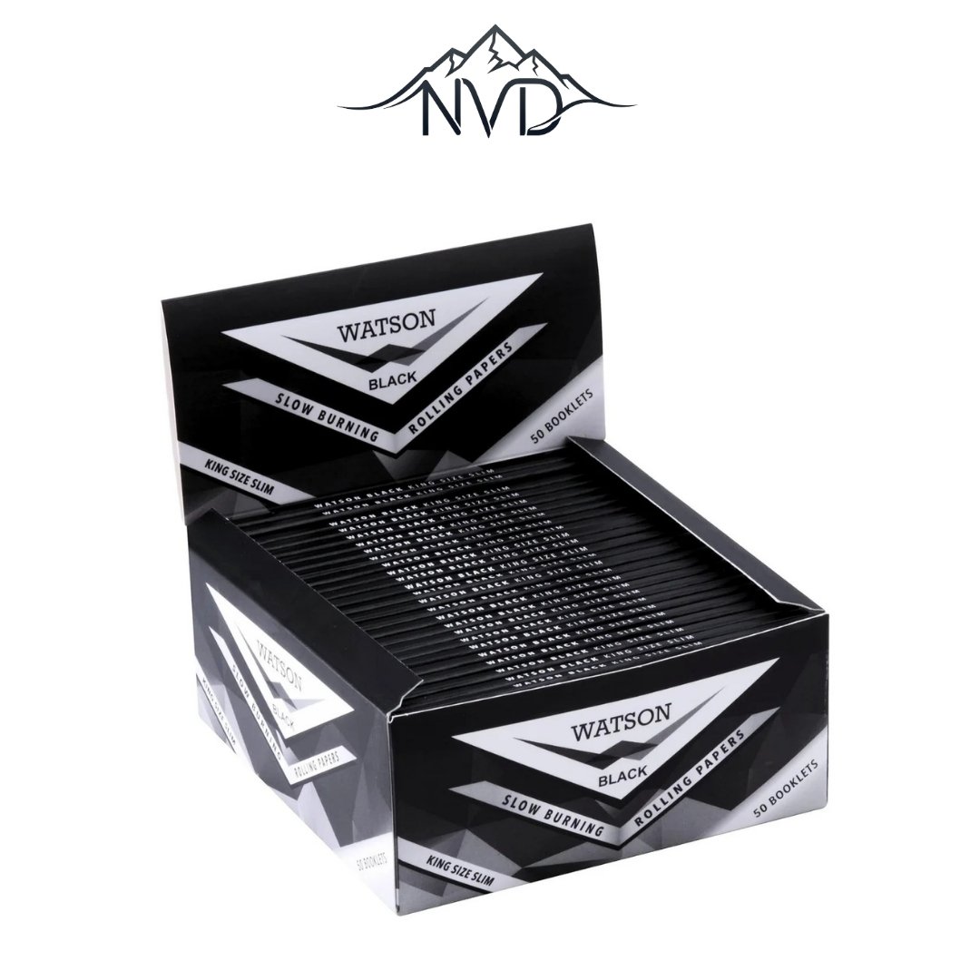 Papier Watson King Size Noir. Composé de 32 feuilles par carnet, ce papier allie praticité et qualité. Fabriqué en papier fin 14 g/m² à combustion lente, il assure une combustion douce et lente pour une expérience de fumage agréable. Emballés individuellement dans un emballage cellophane, ils restent frais et protégés jusqu’au moment de rouler. Fabriqués en papier français et scellés avec de la gomme arabique naturelle, ils sont sans OGM, végétaliens et fabriqués avec des matériaux de haute qualité, pour une fumée responsable.