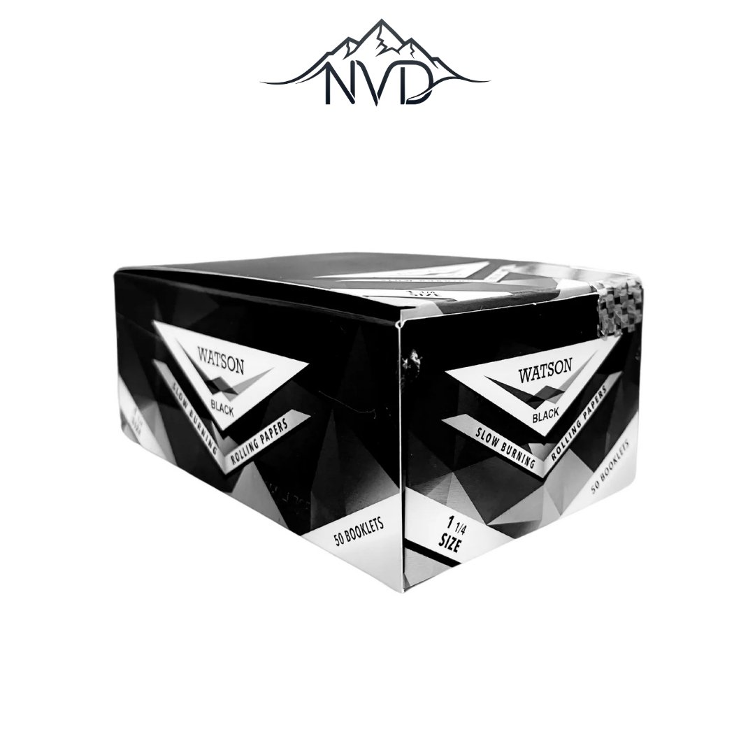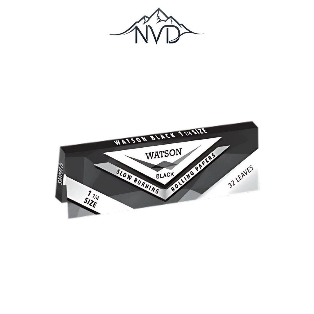 Papier Watson King Size Noir. Composé de 32 feuilles par carnet, ce papier allie praticité et qualité. Fabriqué en papier fin 14 g/m² à combustion lente, il assure une combustion douce et lente pour une expérience de fumage agréable. Emballés individuellement dans un emballage cellophane, ils restent frais et protégés jusqu’au moment de rouler. Fabriqués en papier français et scellés avec de la gomme arabique naturelle, ils sont sans OGM, végétaliens et fabriqués avec des matériaux de haute qualité, pour une fumée responsable.